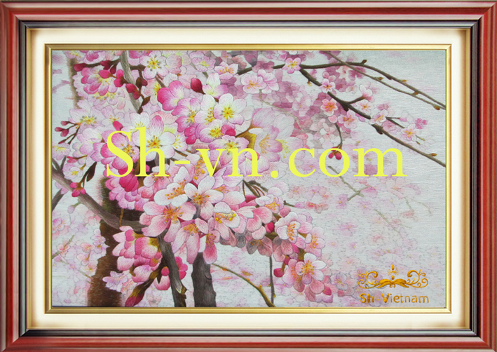 Hoa Anh Đào bắt nguồn từ xứ xở mặt trời mọc – Nhật Bản. Hoa nở rộ nhất vào mùa xuân, mỗi độ hoa nở là sự khởi đầu của những nhiệm vụ mới, bắt đầu cho sự thành công. Với người Nhật Anh Đào bản chất ngắn ngủi của cuộc sống, nét đẹp mảnh mai, dịu dàng, e lệ chỉ một cơn gió thổi ngang sẽ làm cánh hoa lìa cành ngay khi còn đương sắc nhất, giống như tuổi thanh xuân một đi là không trở lại. Vẻ đẹp của hoa Đào đều được thể hiện trong những tác phẩm tranh thêu hoa đẹp một cách tỉ mỉ, công phu.