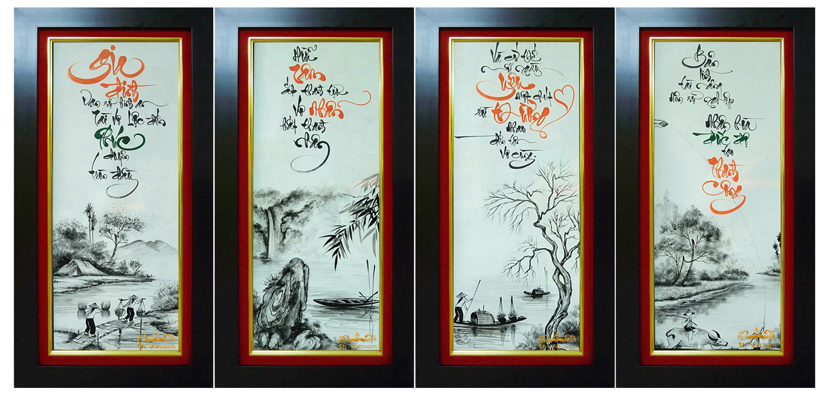 Hình ảnh tứ bình được thể hiện qua những cảnh sắc phù hợp với từng mùa vốn có, mùa xuân thì có những phiên chợ nao nức, tấp nập người quẩy gánh trên vai ra chợ mua sắm, rộn vàng tiếng cười đón chào nàng xuân đang về; một mùa hạ với cánh diều bay cao mang theo mọi muộn phiền lo âu trong năm vất vả đã qua chỉ còn lại những ngày thư giãn; rồi thu đã ghé thăm làm hàng cây trơ trọi không một chiếc lá, tĩnh mịch; hay một mùa đông lạnh giá đã đến như muốn đóng băng nơi đây yên tĩnh, bất động có chút gì đó hiu quạnh. Thêm vào đo là sự kết hợp của những dòng chữ thư pháp bay bổng tràn đầy ý nghĩa nhân văn. Hết thảy đều được thể hiện rất rõ thông qua tác phẩm tranh thêu cao cấp.