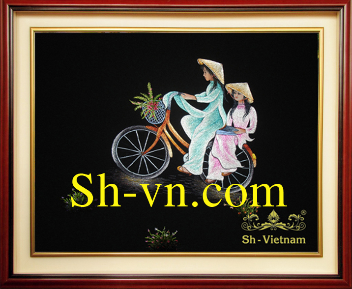 Trong những tác phẩm tranh thêu tay nghệ thuật về tà Áo Dài Việt Nam tại phòng trưng bày của Sh, đã làm toát lên một sự sống động đạt độ chân thực cao. Người con gái trong bộ cánh truyền thống tôn lên những đường nét cơ thể của một thiếu nữ quyến rũ theo cách kín đáo, đằm thắm.
