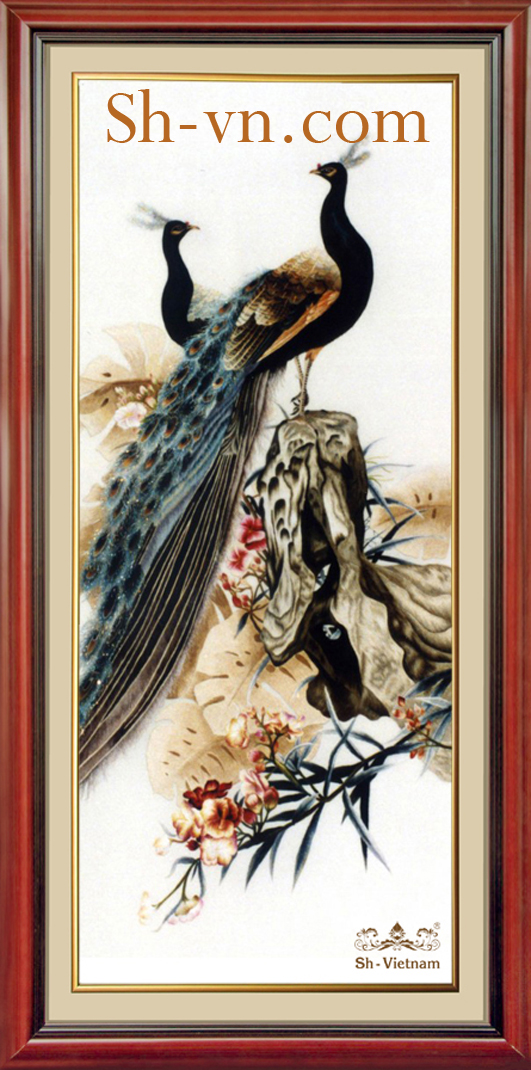 Một loài chim khác cũng mang vẻ đẹp cao sang, phú quý xuất hiện trong những mẫu tranh thêu tay đẹp nhất hiện nay của Sh Vietnam chính là chim công. Và bộ sưu tập tranh nổi bật nhất chính là tranh thêu tay Đôi Uyên Ương với hình ảnh đôi công quấn quýt vô cùng bình yên và hạnh phúc.