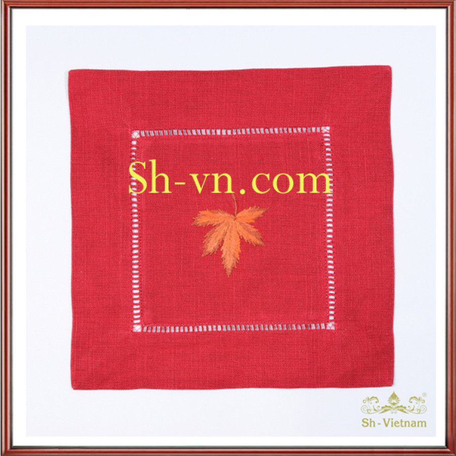 Đặc biệt, tác phẩm khăn trải bàn hình chữ nhật này sử dụng tông màu đỏ làm nền khăn, tạo nên sự nổi bật và đầy quyến rũ. Hình ảnh chiếc lá thu phong như mang đến cả mùa thu tươi đẹp, đằm thắm.