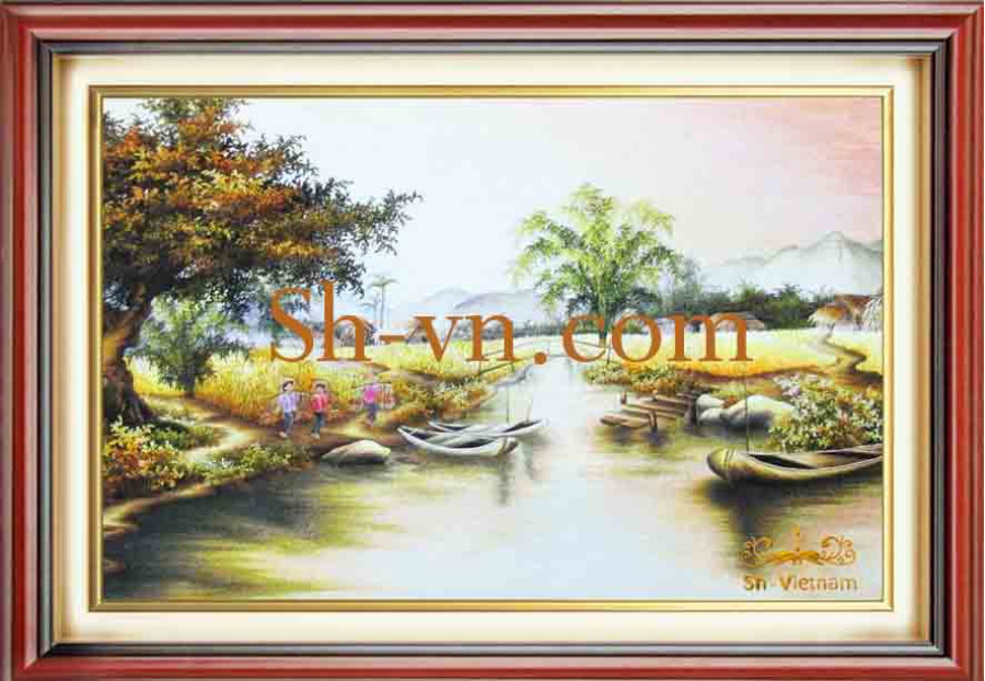 Và để giúp quý khách cảm nhận rõ hơn nét đẹp của dòng tranh lụa, Sh Vietnam xin giới thiệu tác phẩm tranh có tên gọi Bến nước tình quê. Đây là một bức tranh thêu tay nghệ thuật được thực hiện công phu, tinh xảo từ chất liệu lụa tơ tằm thiên nhiên cao cấp. Tác phẩm miêu tả lại cảnh họp chợ trên bến sông quê, mang đậm nét đẹp của chợ nổi truyền thống miệt đồng bằng sông nước.
