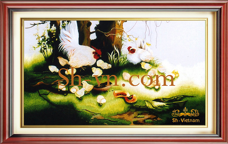 Sum vầy là một bức tranh thêu cao cấp ra đời từ cảnh sinh hoạt hết sức giản dị của đàn gà nhỏ. Trong một góc sân vườn bên bờ giậu, đàn gà trống mai đang quấn quýt bên nhau như đang chuyện trò, tâm sự.