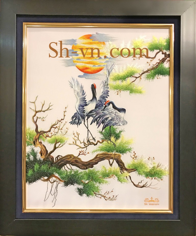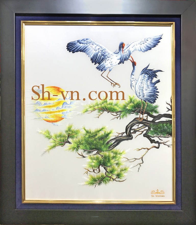 Điển hình như tuyệt tác tranh thêu Tùng Hạc “Tổ ấm” (5009) mang quý khách thả hồn vào khung cảnh bình yên của một buổi chiều hoàng hôn lãng mạn. Đôi chim Hạc tựa đôi tình nhân đang tâm tình trìu mến.