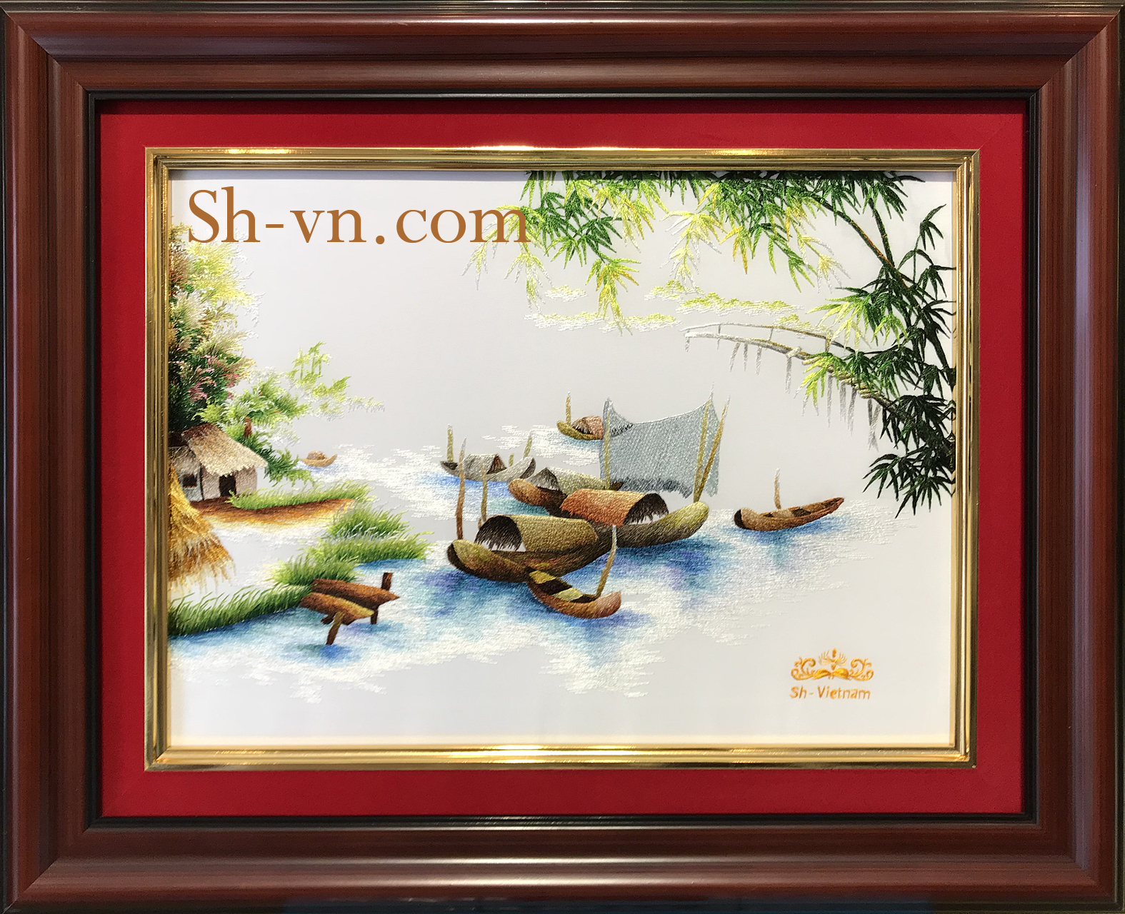 Trên bến sông quê, những chiếc thuyền nhỏ chở đầy sản vật quê nhà như trái cây, rau củ, tôm cá,… đang tụ họp lại cùng nhau, tạo thành một cái chợ nổi đặc biệt giữa bốn bề sóng nước. Dù là miêu tả lại cảnh họp chợ, những bức tranh thêu tay cao cấp này không hề lộn xộn nhốn nháo, mà rất trật tự và từ tốn.