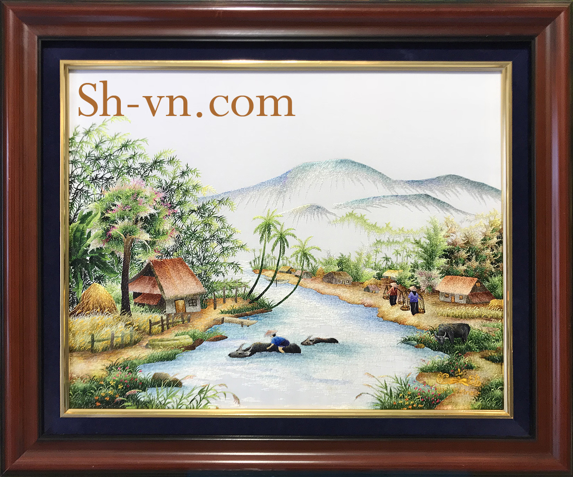 Bằng tình yêu quê hương sâu sắc, nghệ nhân Sh đã cho ra đời tác phẩm tranh thêu này với vẻ đẹp hiền hòa, mộc mạc. Tác phẩm sẽ mang lại cho quý khách những phút giây thanh thản, thoải mái khi ngắm nhìn và luôn nhớ về quê hương, nơi chôn nhau cắt rốn.