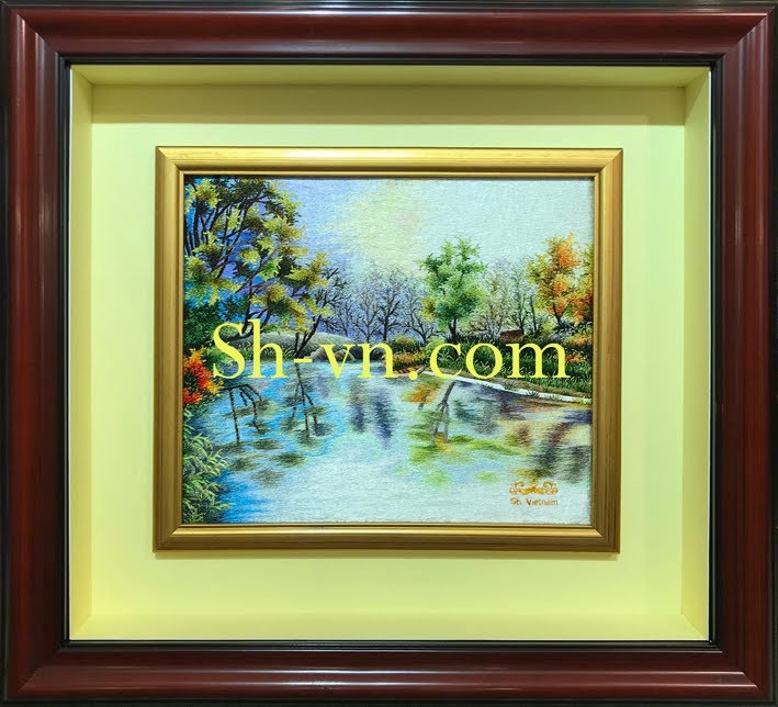 Mời quý khách thưởng lãm tác phẩm tranh thêu tay cao cấp ‘Phong cảnh 5’ (810), khắc họa lại một không gian hiền hòa dịu dàng của mặt hồ. Giữa khu rừng hoang vắng, góc không gian này như tô điểm thêm sắc màu.