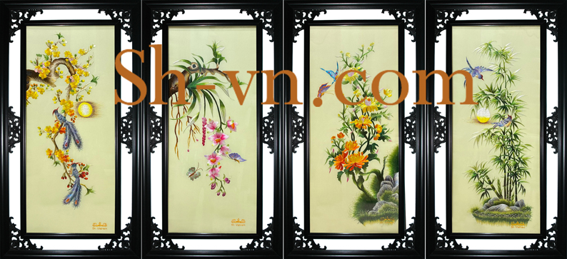 Tại Sh Vietnam, tranh thêu Tùng Cúc Trúc Mai được thực hiện bởi những nghệ nhân có tuổi nghề lâu năm. Họ sử dụng chất liệu lụa tơ tằm thượng hạng để thêu nên hình ảnh bốn loài cây đại diện cho bốn mùa trong năm.